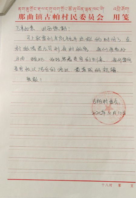 馬上就要到年底牦牛出欄的時(shí)間了,全村要求貴公司到我村做客,我們將備好牛肉、酸奶、拉拉(編輯注:拉拉是當地的一種奶制品。)等著(zhù)貴客的到來(lái),我們要向貴客致以潔白的哈達、最真誠的祝福!